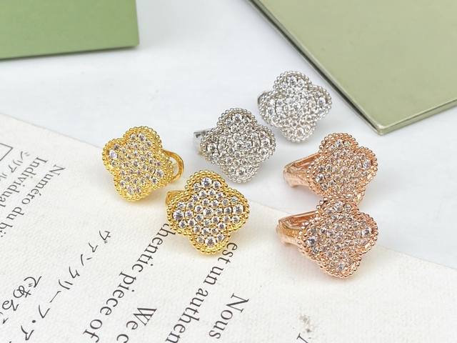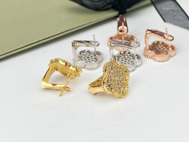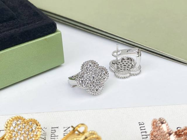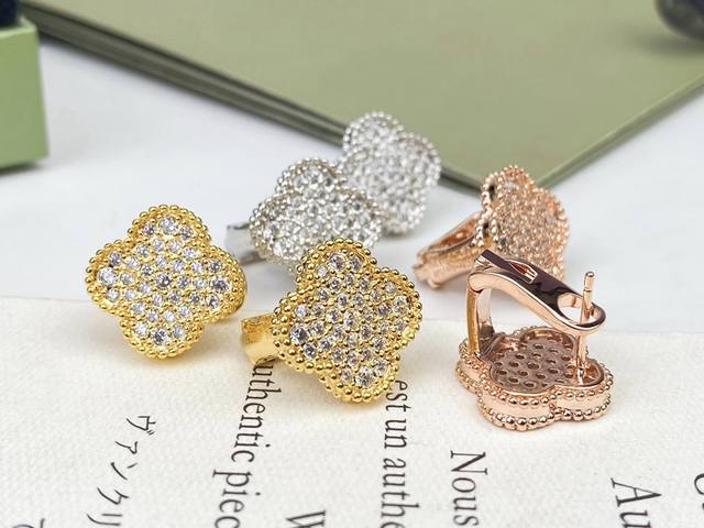 Vca Van Cleef & Arpels full diamond four-leaf clover earrings, ear clip replica, original earring design with 925 sterling silver needles, 18K gold plated with imported high-carbon diamonds. Exclusive real shot, craftsmanship visible in the picture [spinning] White gold, magenta, yellow gold, three colors