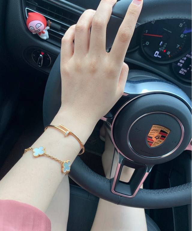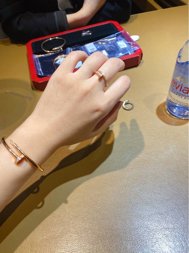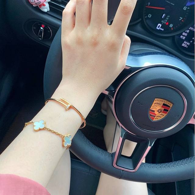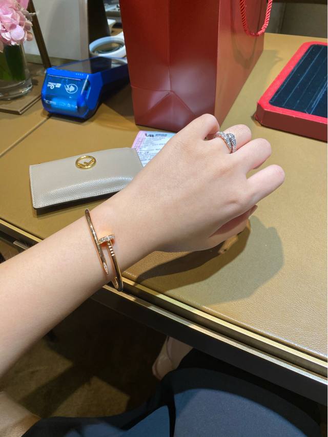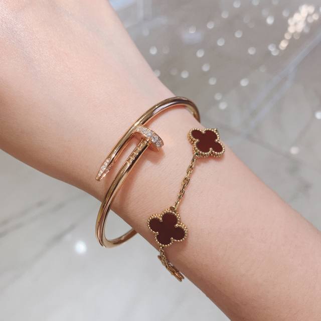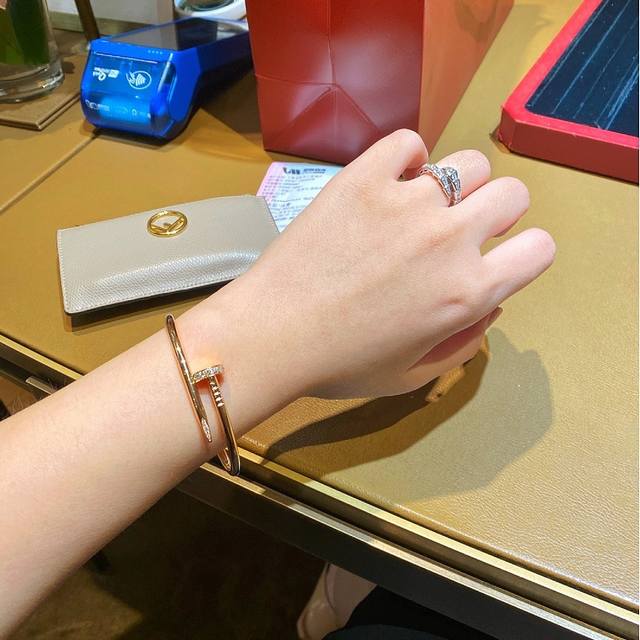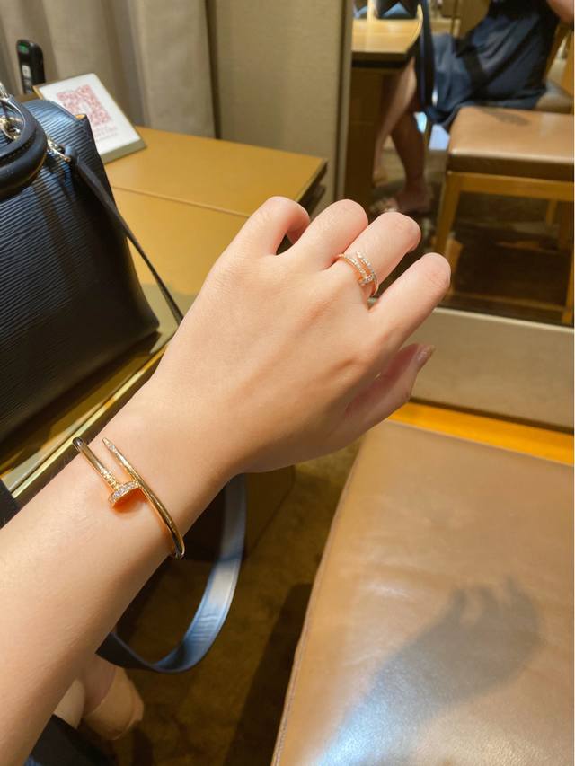 We offer a classic diamond-encrusted nail bracelet, available in a thicker version with diamonds at both ends. Our nail series is also incredibly classic, and the bracelets, rings, and necklaces in the same series are absolutely stunning. They look great worn alone or layered with other jewelry. We've already customized a thinner version of the nail bracelet with springs, a nail necklace, and a nail ring, all of which have received excellent feedback and are bestsellers. This version features thick, solid nails, while the thinner version has hollow nails with springs. Both are 100% accurate. We adjusted the thickness beforehand, but the final version was too thick, so it took another month to complete. We produced three versions, resulting in significant development costs. We absolutely spare no expense in achieving the ultimate level of detail. Many of my friends own this piece, and if the final product doesn't match the original, it's embarrassing not only for the customers but also for me. You can see for yourself when you receive the actual product; it's absolutely exquisite, comparable to the quality of real gold. It features hand-set ends and is entirely plated with 0.5mm V gold.
