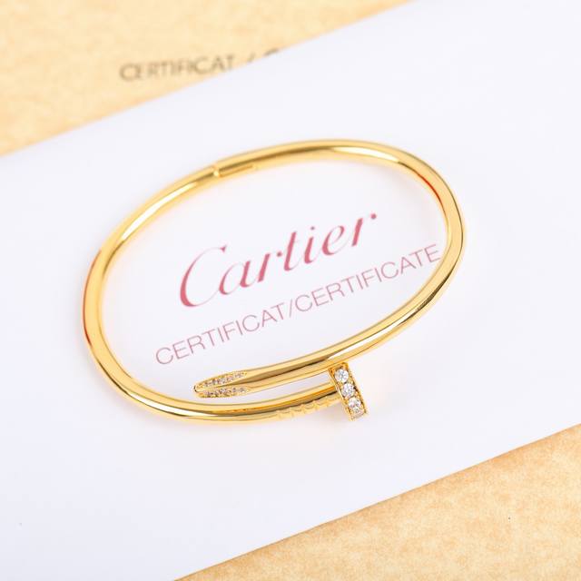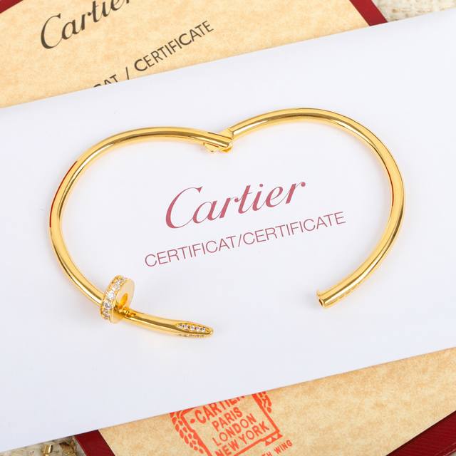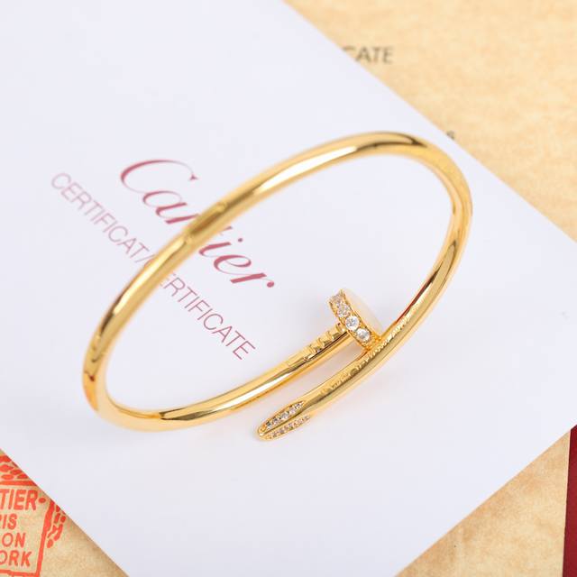 We offer a classic diamond-encrusted nail bracelet, available in a thicker version with diamonds at both ends. Our nail series is also incredibly classic, and the bracelets, rings, and necklaces in the same series are absolutely stunning. They look great worn alone or layered with other jewelry. We've already customized a thinner version of the nail bracelet with springs, a nail necklace, and a nail ring, all of which have received excellent feedback and are bestsellers. This version features thick, solid nails, while the thinner version has hollow nails with springs. Both are 100% accurate. We adjusted the thickness beforehand, but the final version was too thick, so it took another month to complete. We produced three versions, resulting in significant development costs. We absolutely spare no expense in achieving the ultimate level of detail. Many of my friends own this piece, and if the final product doesn't match the original, it's embarrassing not only for the customers but also for me. You can see for yourself when you receive the actual product; it's absolutely exquisite, comparable to the quality of real gold. It features hand-set ends and is entirely plated with 0.5mm V gold.