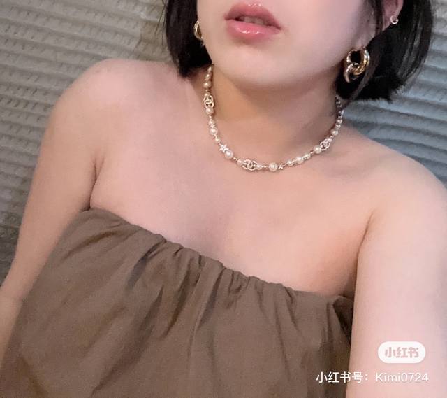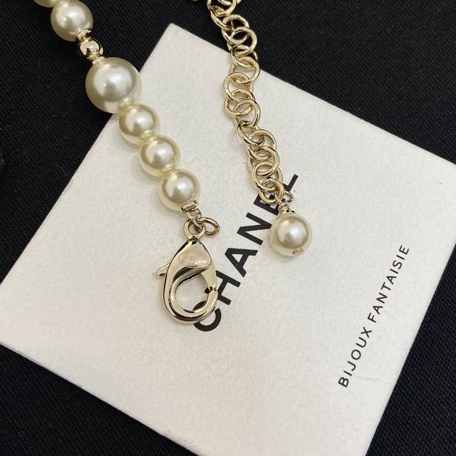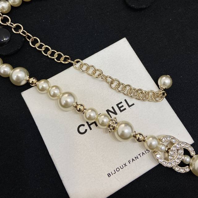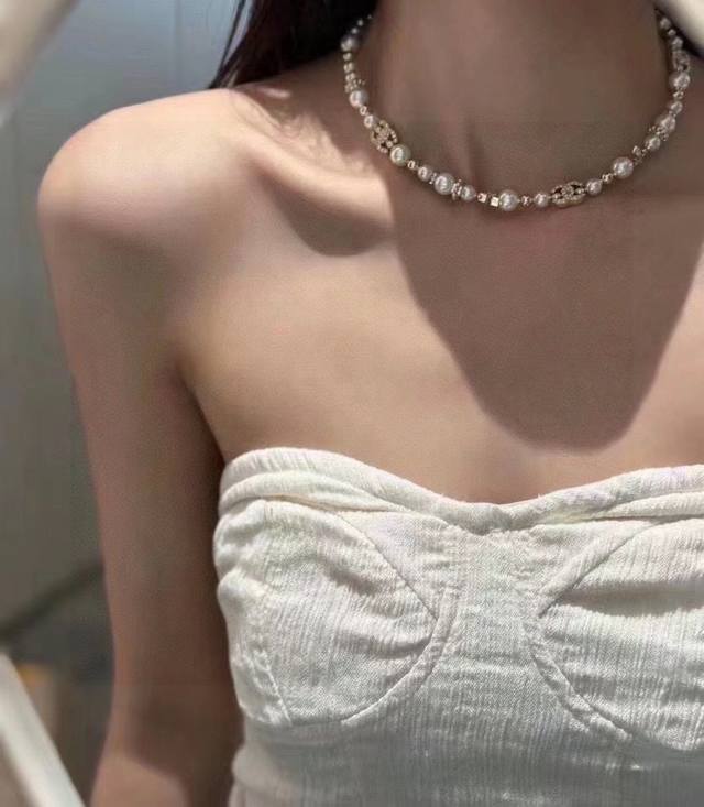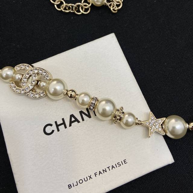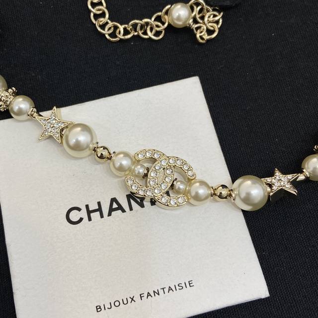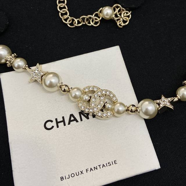 Ch Nel23A Gold Full Diamond Double C Small Star Pearl Necklace Choker