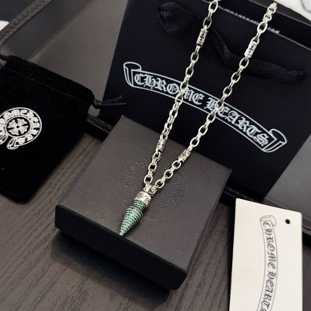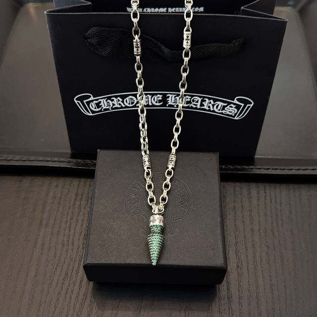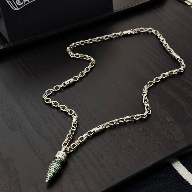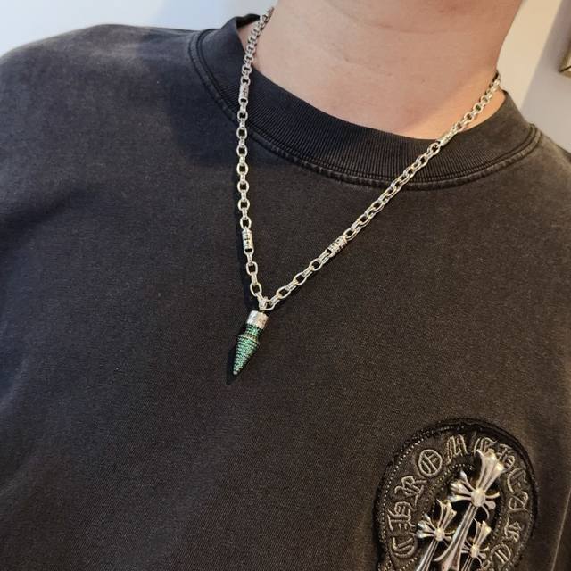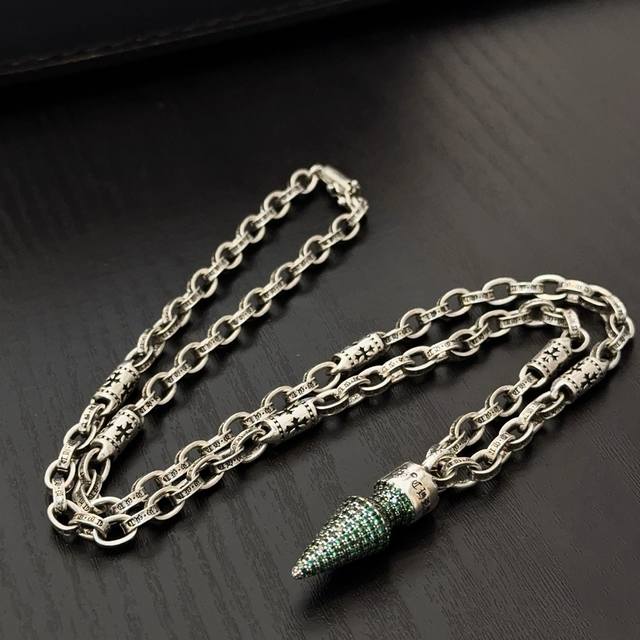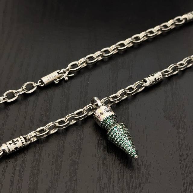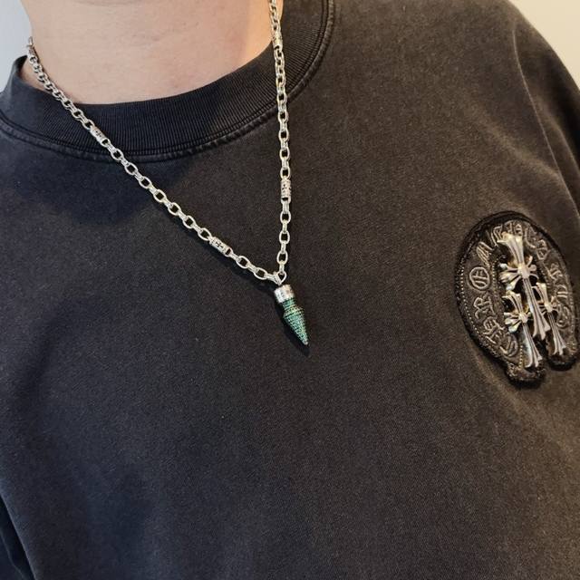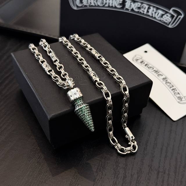 New boutique quality Chrome Hearts classic retro necklace with green diamond bullet pendant. The embossed design and different patterns create a unique look. The cross and scout flower are Chrome Hearts' signature elements, making it timeless. Authentic Chrome Hearts replica, different from ordinary versions on the market. High-quality replica, check the details of the lettering and the vintage distressed finish. Exquisite craftsmanship! Handmade! Authentic mold, trendy and fashionable, a must-have for men and women, suitable for couples. Official website original, rock punk Thai silver style, retro elements, trendy and versatile!