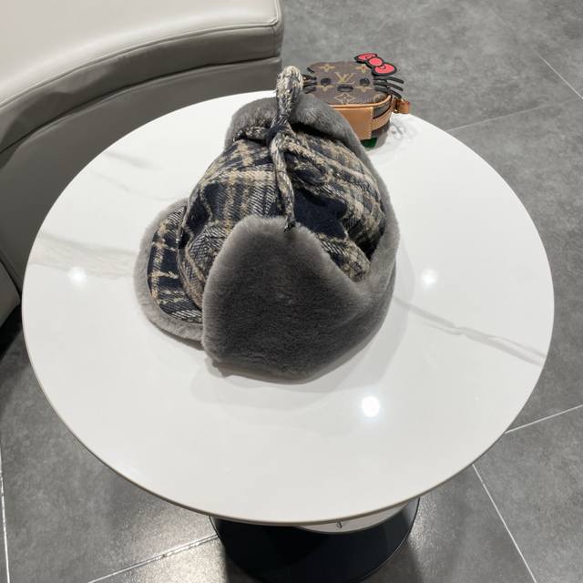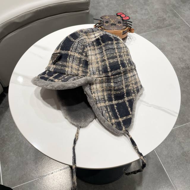 Prada couple's plaid fleece-lined Lei Feng hat, women's warm ear-protecting winter woolen windproof cycling pilot thick hat, men's