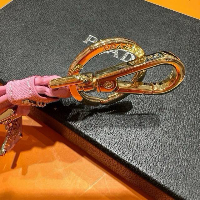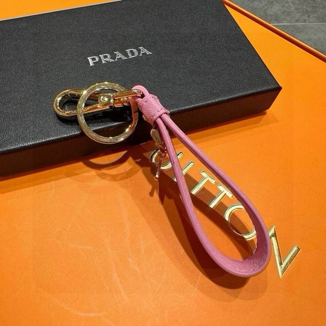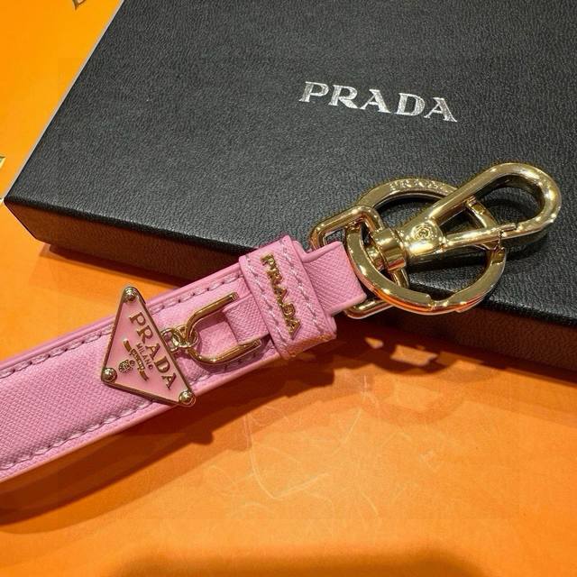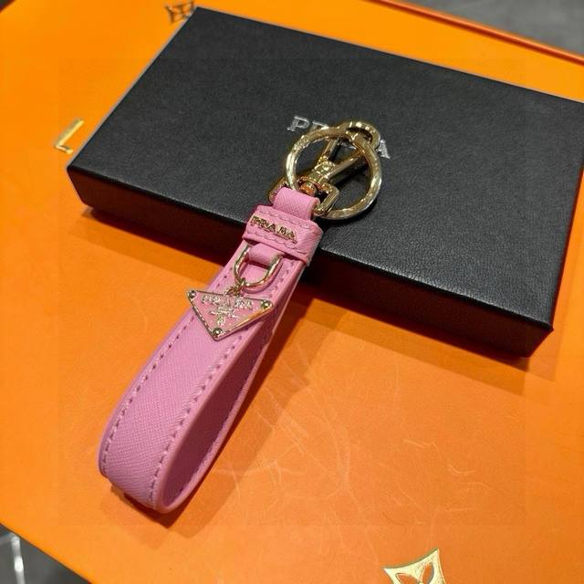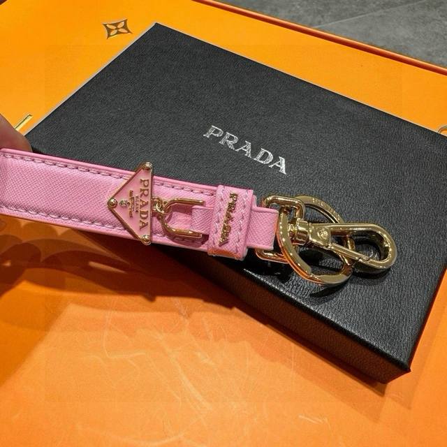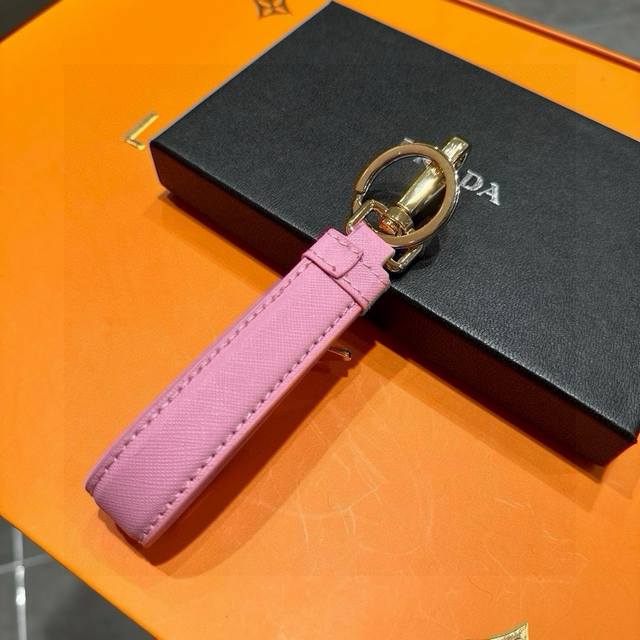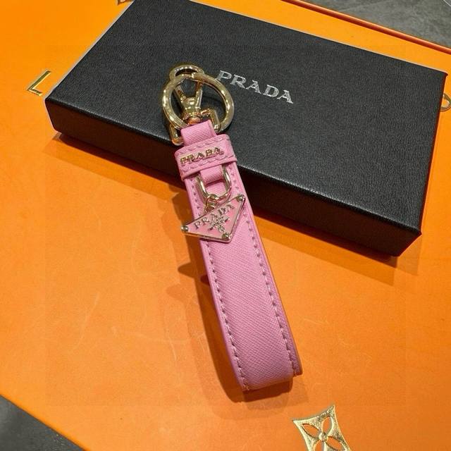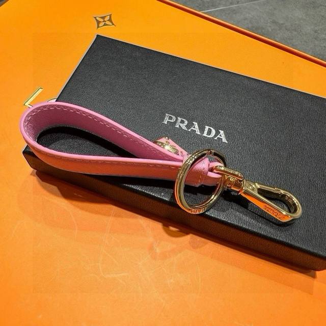 Prada New-Style Leather Keychain With A Triangular Plaque, Polished Steel Accessories Consisting Of An Open Ring And A Metal Hook, Exuding Unique Charm. 0401319100