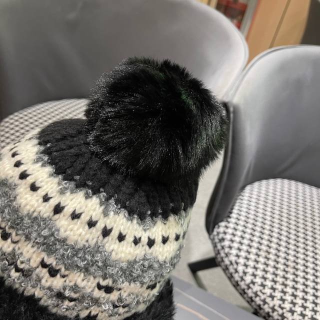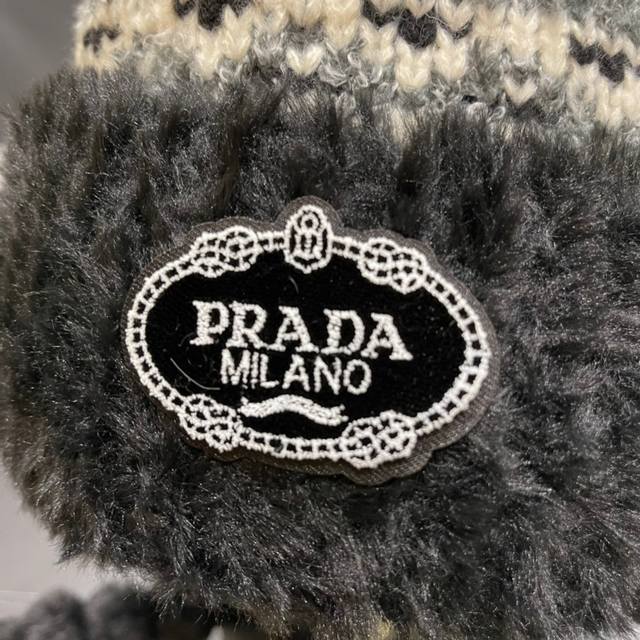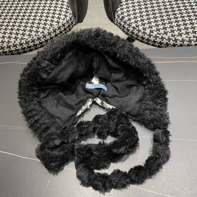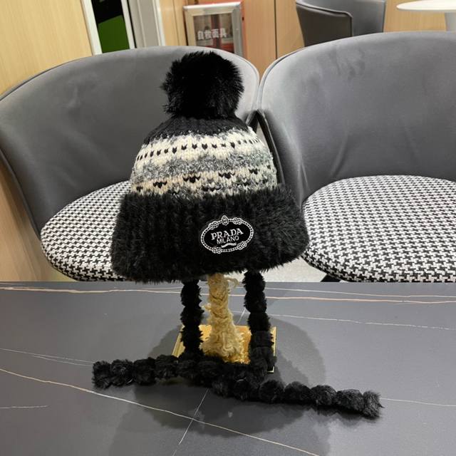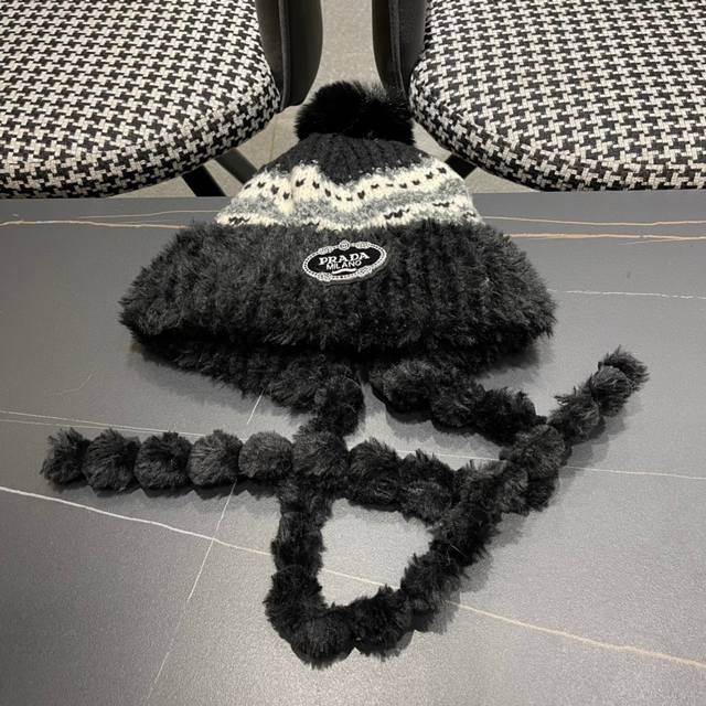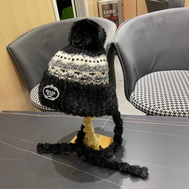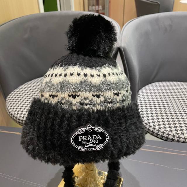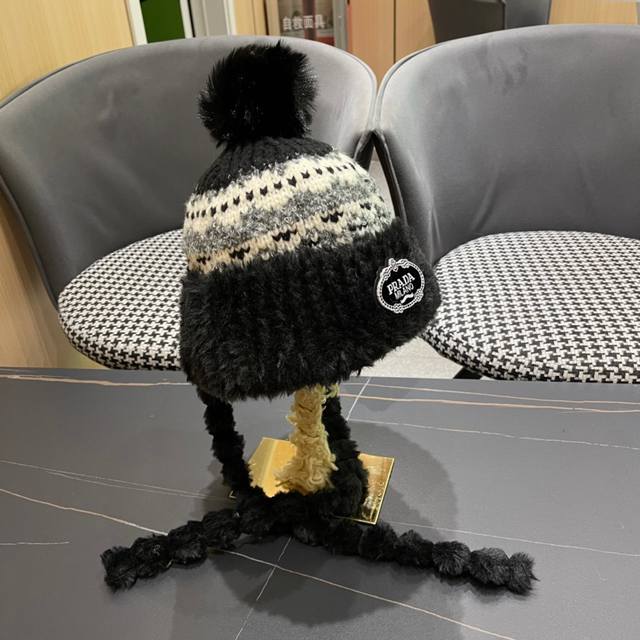 Prada plush knitted braided ear flap Lei Feng hat for women, autumn and winter t