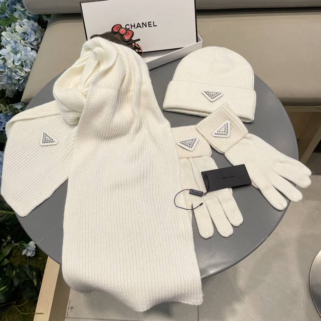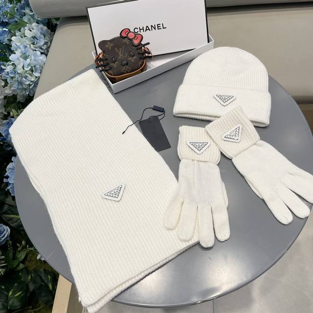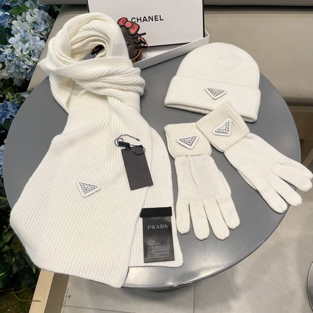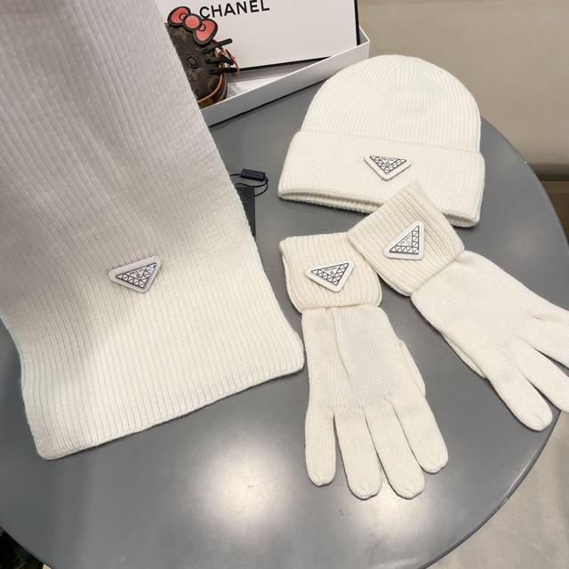 Prada three-piece suit. A classic wool hat set! The hat, scarf, and gloves are warm and super comfortable. A perfect winter accessory for young ladies! This hat set is all you need this winter! It's warm and stylish! Unisex and can be used as a couple's style! Complete with security labels and hang tags! Lots of styles!