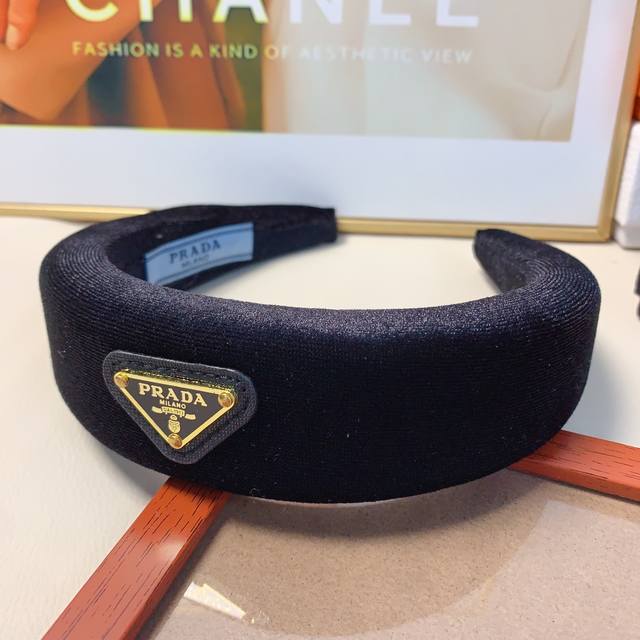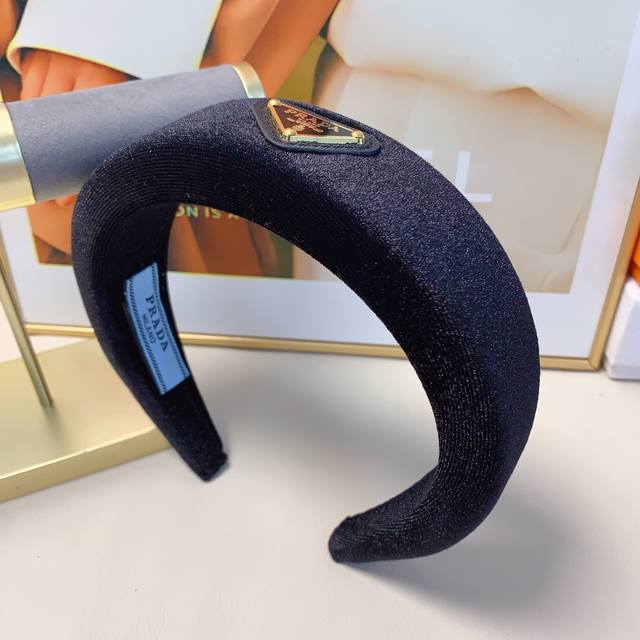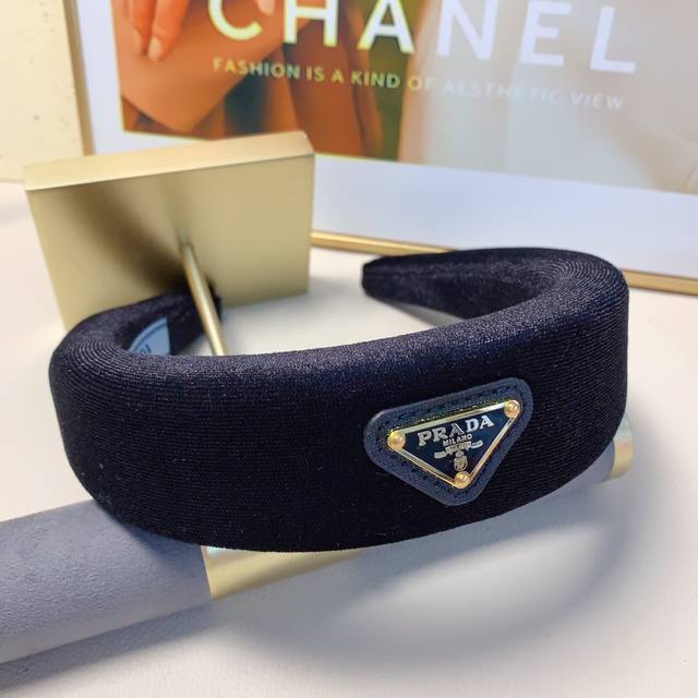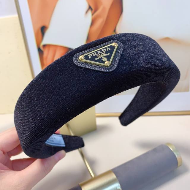 Prada headband, a simple yet luxurious headband with a velvet triangle brand design. A must-have for any fashionista, exuding elegance and sophistication. A treasure among gems, a must-buy! Single item.