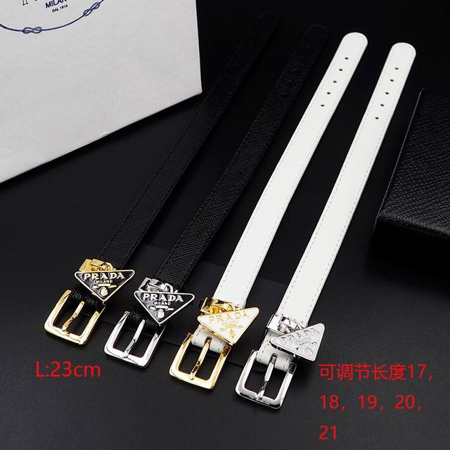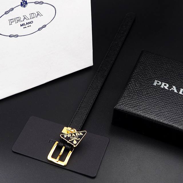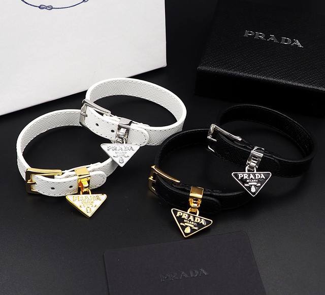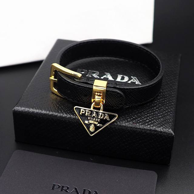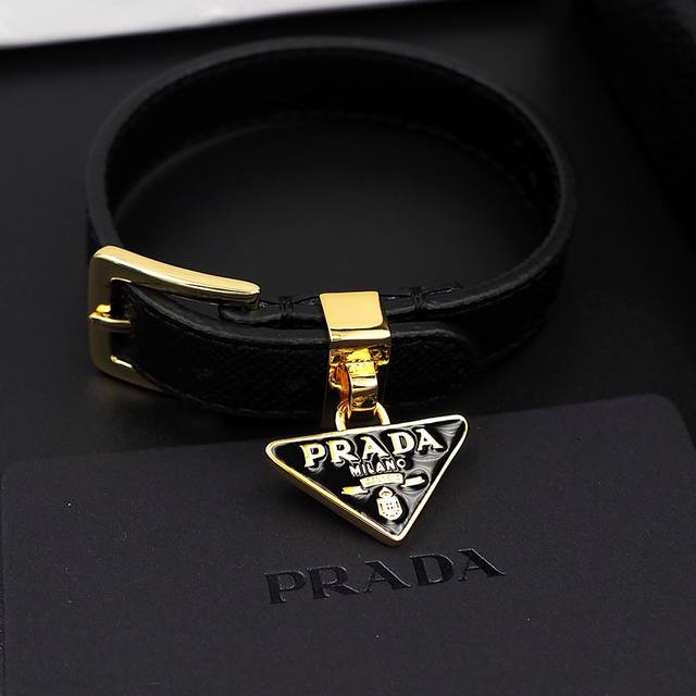 Prada's elegant Safhano leather bracelet showcases its feminine design, exuding softness and charm, while the triangular metal logo embellishment adds a touch of brand sophistication.