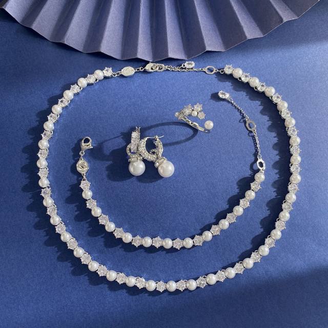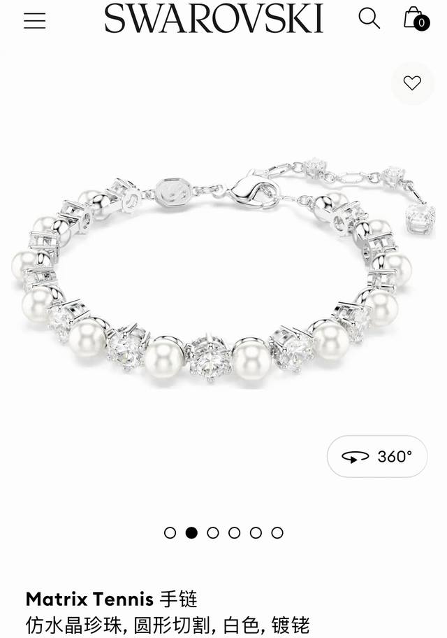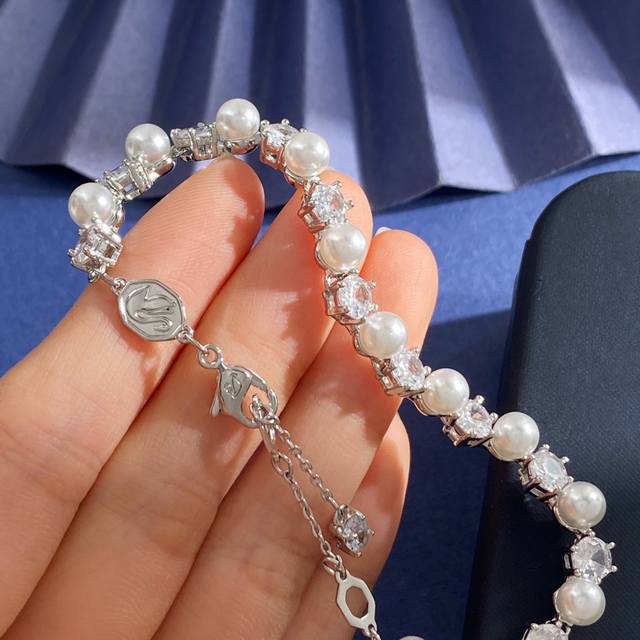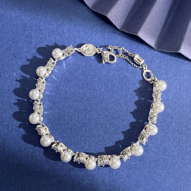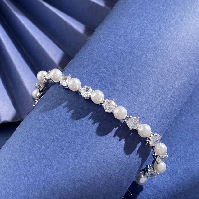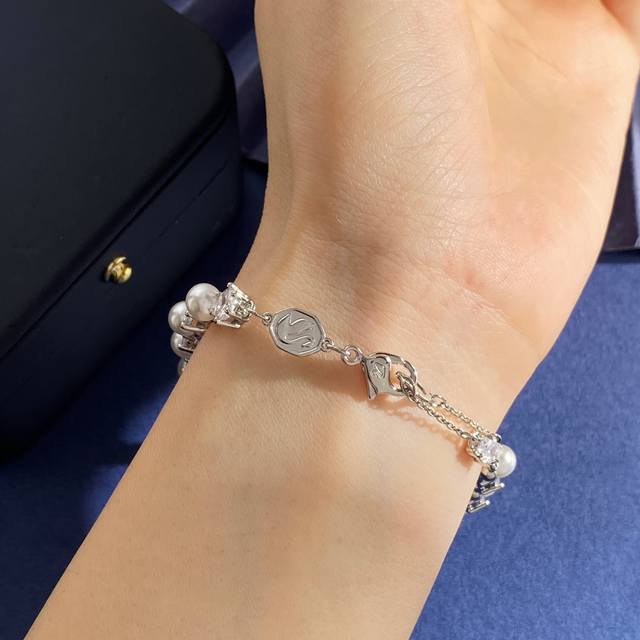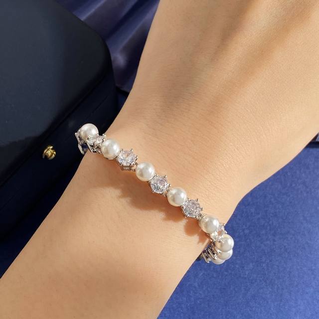 Swarovski Fashionable and Elegant Round Cut White Diamond and Pearl Bracelet, Brass Material, Silver Bracelet, Weight approx. 12.3g; Bracelet Length approx. 18.5cm + 2cm + 1.5cm + 0.7cm, Tag Number
