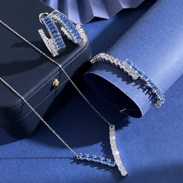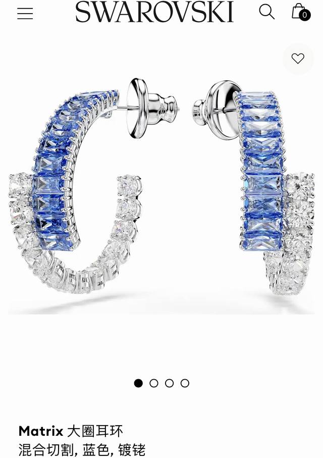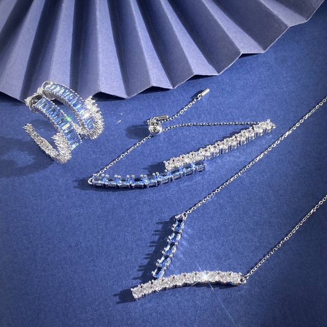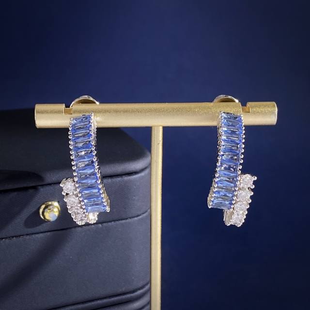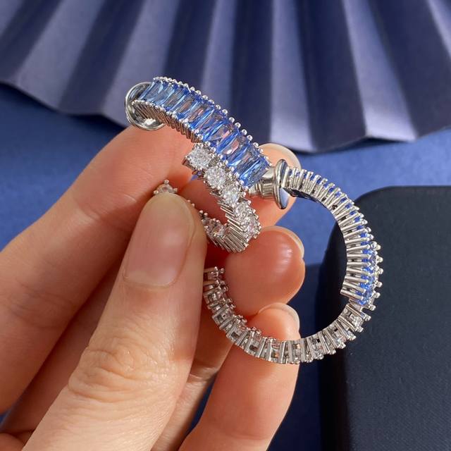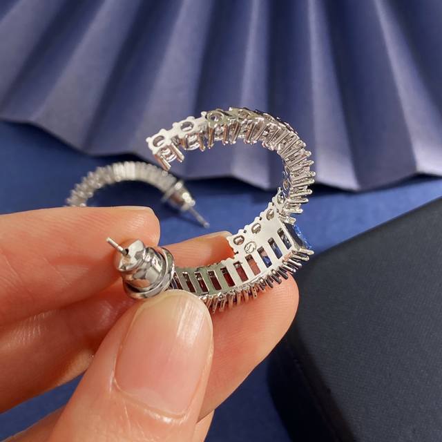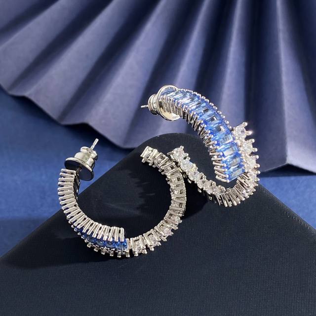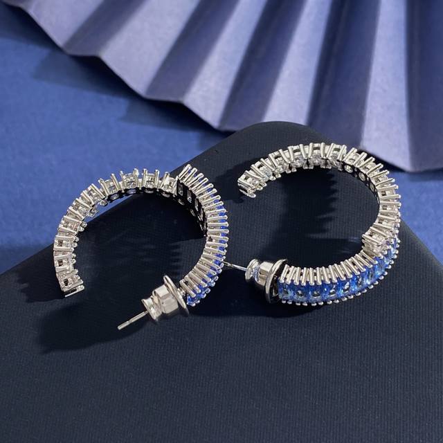 Swarovski European and American fashion large hoop design mixed cut blue zircon diamond C-shaped earrings, brass material, silver earrings, weighing approximately 10.7g; dimensions approximately 3cm*3cm*1cm