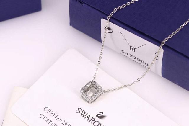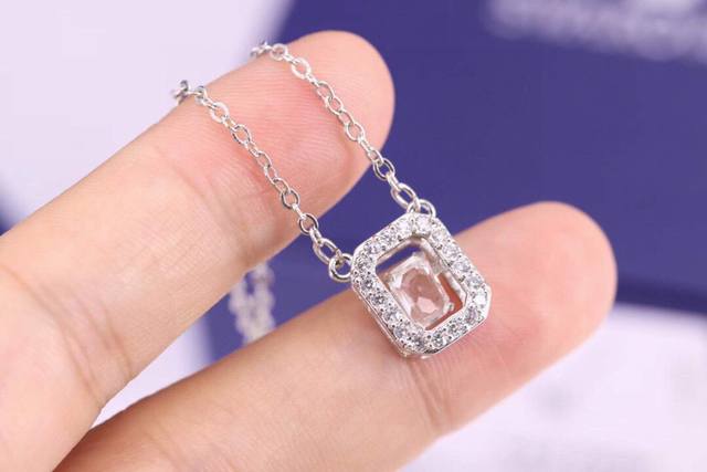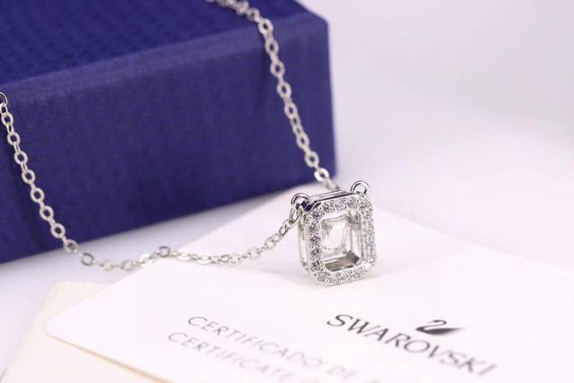 ) This pendant necklace features a dazzling octagonal design, making it a wardrobe staple. A delicate rhodium-plated chain holds a clear step-cut crystal, surrounded by small brilliant-cut crystals. It will move with your body when worn. (