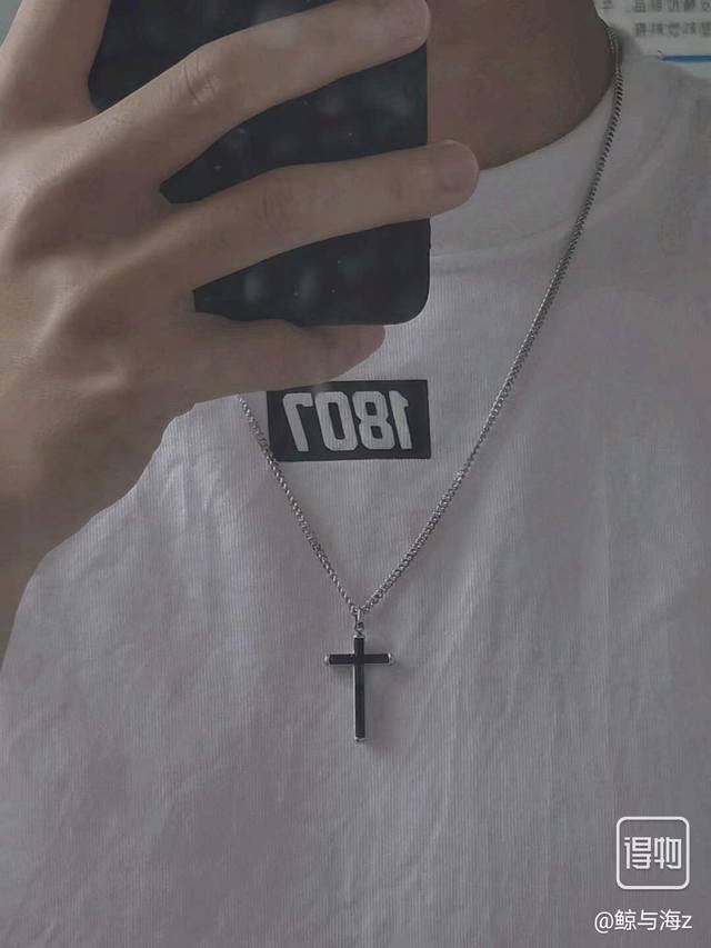 ) This cross-shaped necklace, paired with grey rectangular-cut crystals, adds a refreshing touch to any outfit. Suitable as a couple's or brothers' necklace. Length: 50cm. (