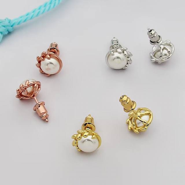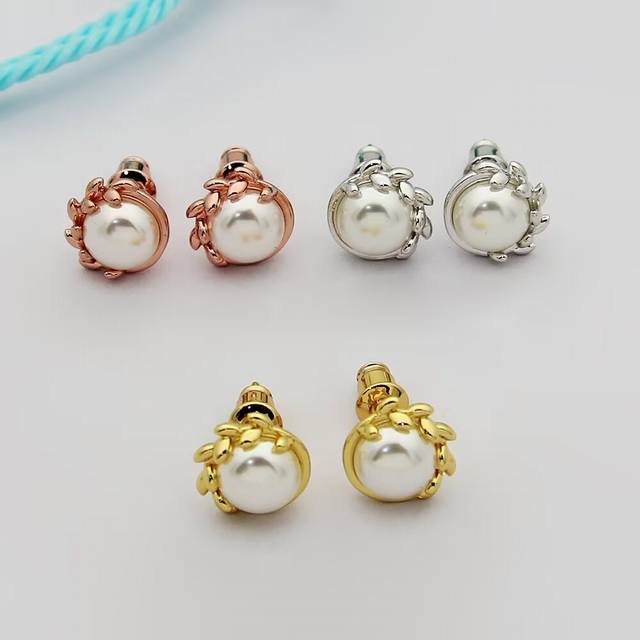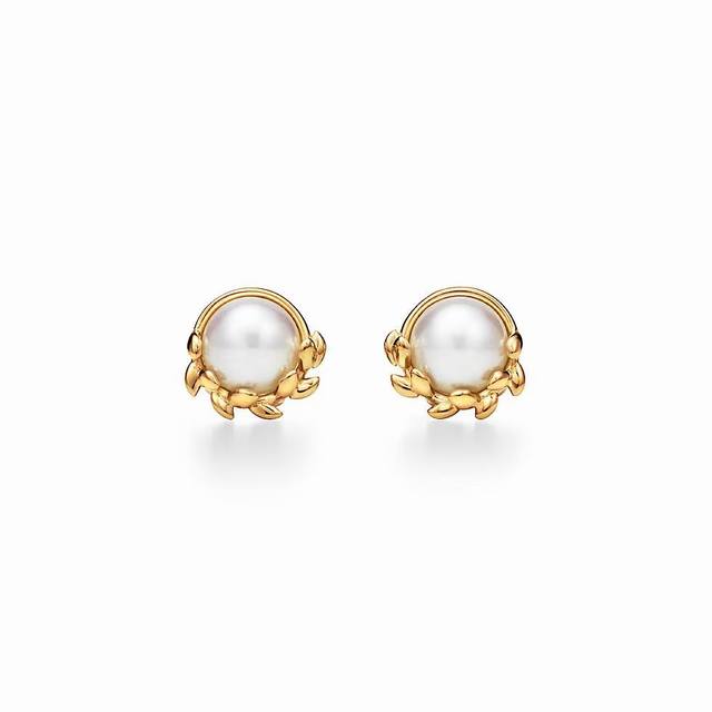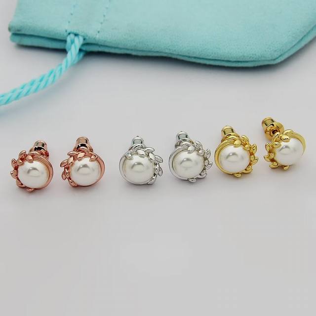 Tiffany olive leaf pearl earrings. Olive leaves are also known as a symbol of peace, wisdom, victory, and hope. Shipped from the OEM factory, each leaf is exquisitely and perfectly polished, lifelike, and a truly pleasing sight.