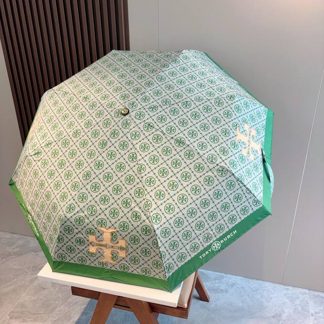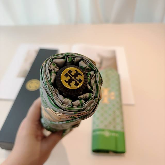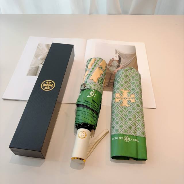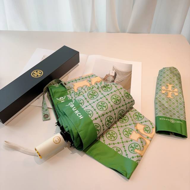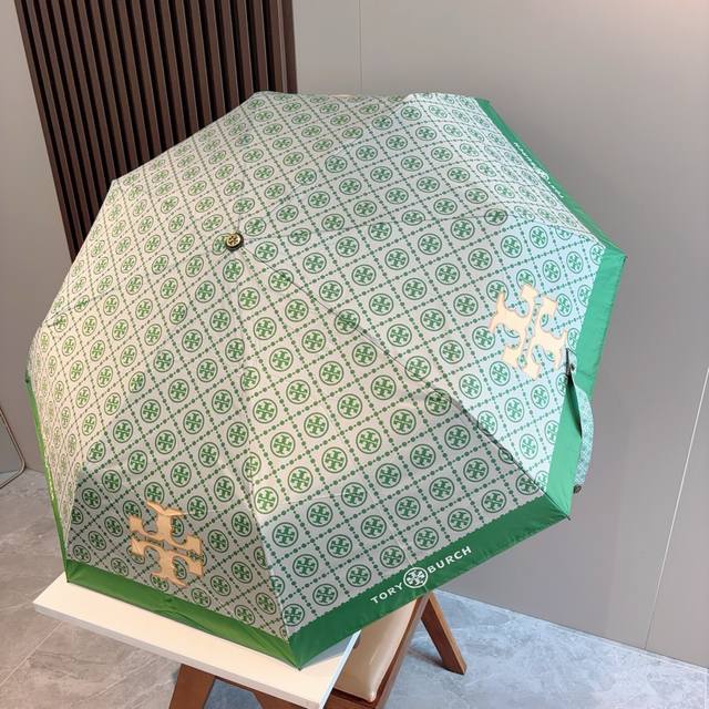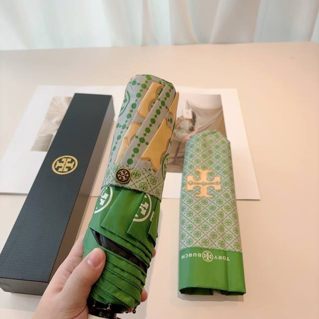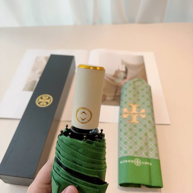 Tory Burch's exclusive first release of the Tory Burch tri-fold, fully automatic black vinyl sunshade UV umbrella with retractable ribs! Giving you an unparalleled experience, walking down the street with this umbrella instantly makes you look incredibly stylish. Made with genuine OEM quality, the umbrella features a UV-protected cover imported from Taiwan and ultra-light aluminum alloy ribs. Lightweight materials are used for both the cover and the handle, making it easier to carry in your bag.