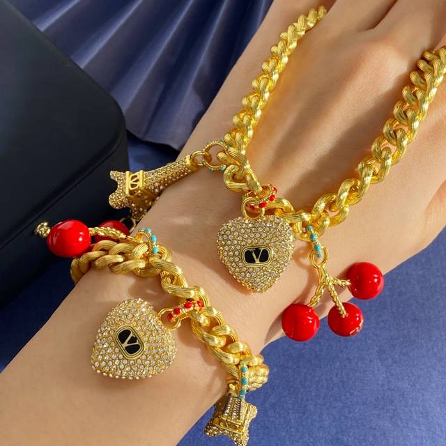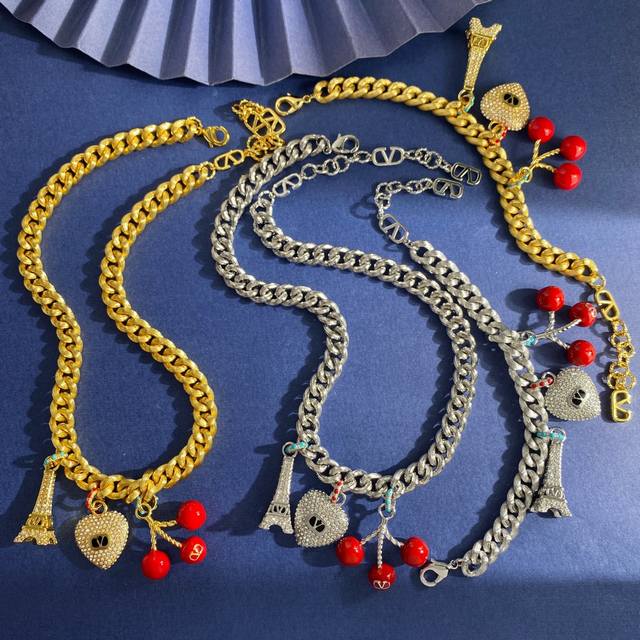 Valentino European and American style elegant red enamel cherry and Eiffel Tower heart-shaped pendant necklace, made of brass, available in gold and silver. Necklace weight approx. 94.3g; necklace length approx. 42cm + 4.5cm + 3.5cm