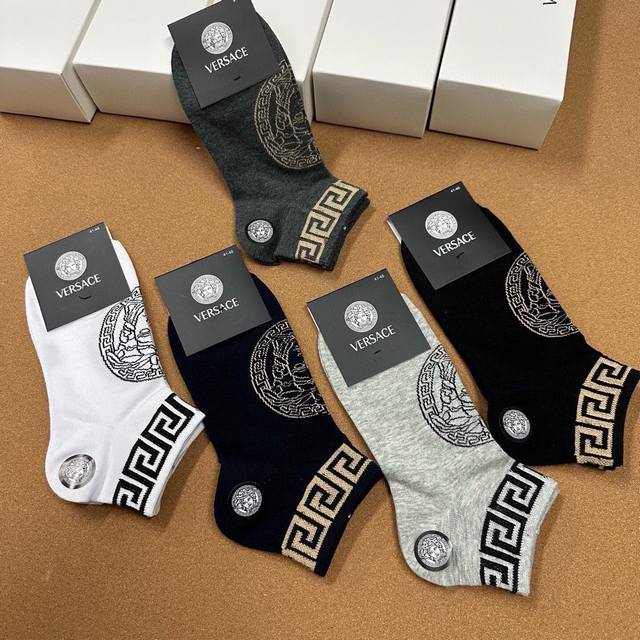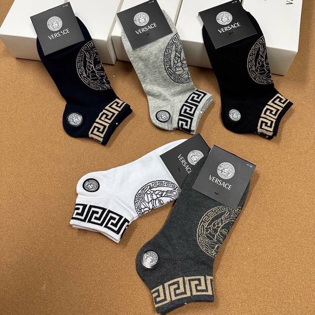 New Versace men's socks, box of five pairs, made of pure cotton, super soft and comfortable, with classic jacquard logo. A super popular item on Instagram, a must-have for trendsetters, and easy to match.