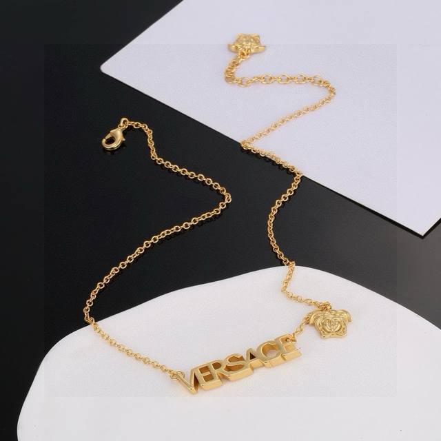 Versace This gold necklace is an elegant accessory, decorated with a Medusa head and letter pendant. It is a unisex necklace.