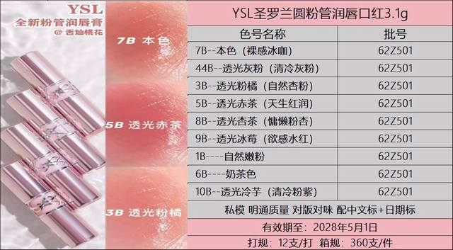 Can be matched with Chinese-labeled Yves Saint Laurent pink round tube lipstick 3.1G! Color numbers: 1B#, 3B#, 5B#, 6B, 7B#, 8B#, 9B#, 10B, 44B#.