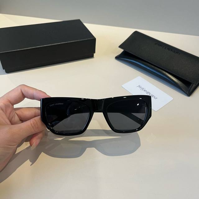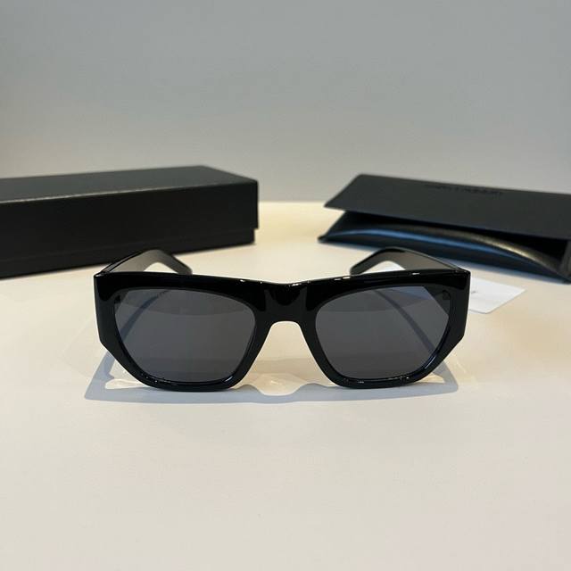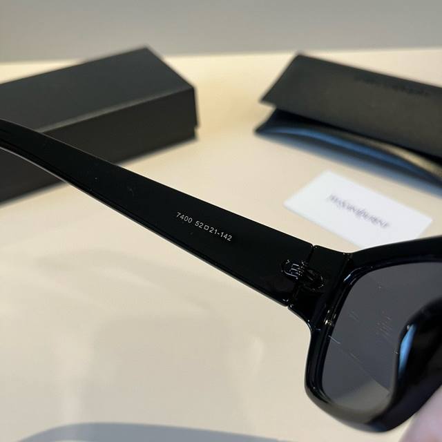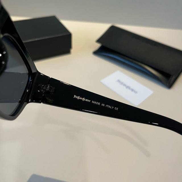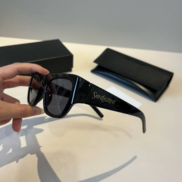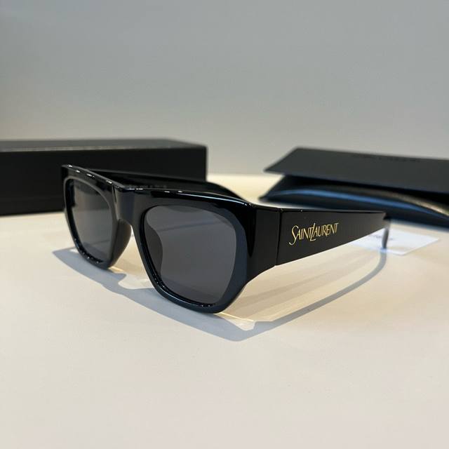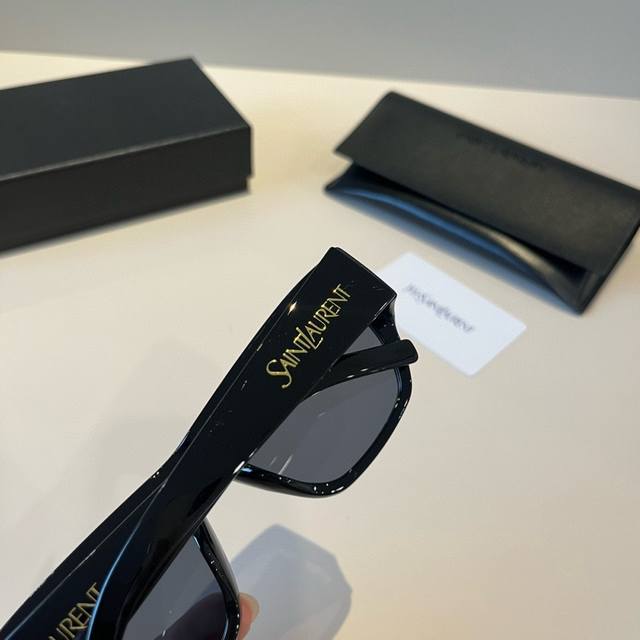 Saint Laurent's new narrow-frame sunglasses feature a black, thick frame with straight lines, exuding a cool, unisex appeal. Combined with retro tortoiseshell temples that present an elegant, curved silhouette, they create a feminine charm that is both soft and strong. The classic gold logo is engraved on both temples, showcasing the brand's personality.