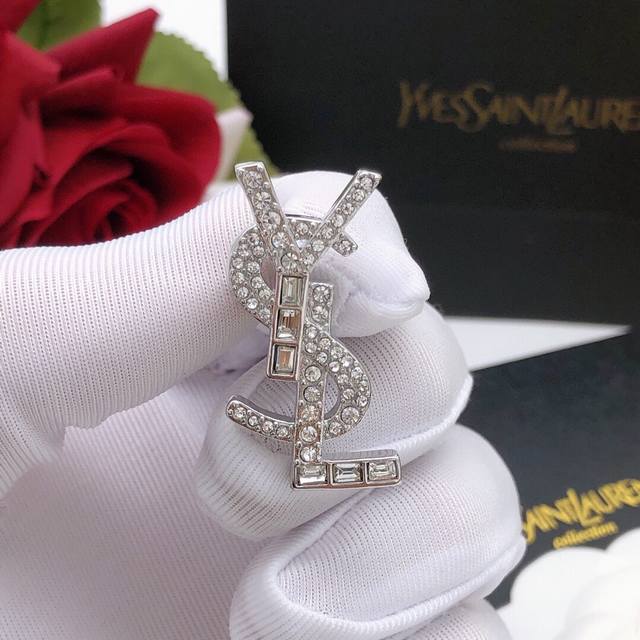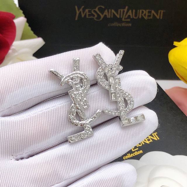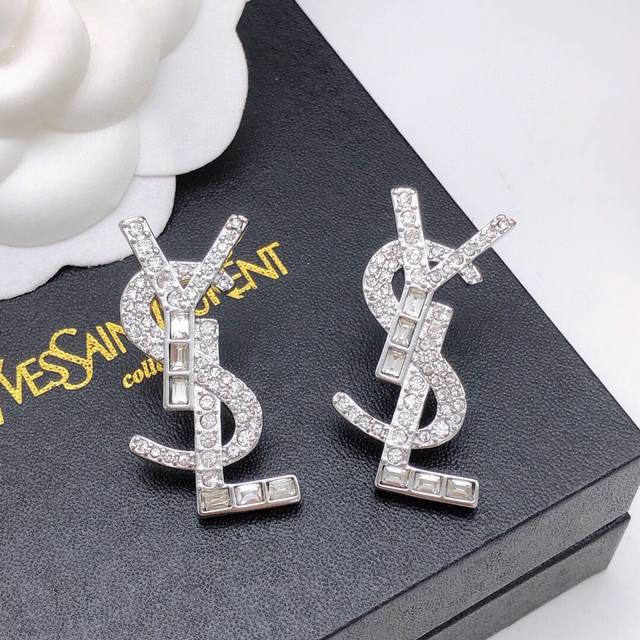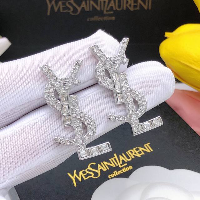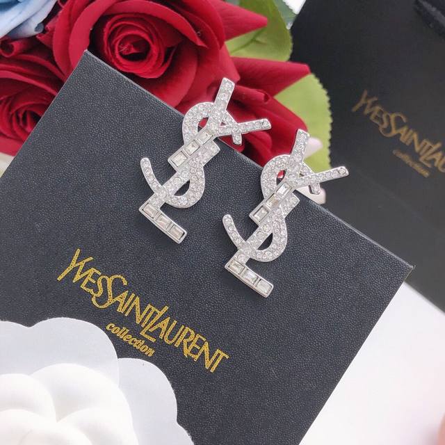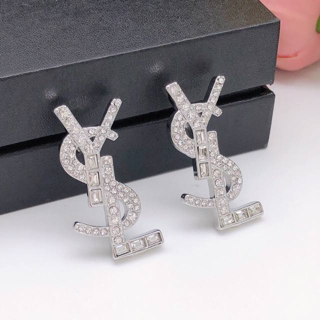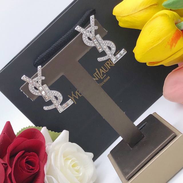 Saint Laurent YSL Letter Stud Earrings with Diamond Square Diamonds, Silver. Exquisite and fashionable design, a must-have for women.